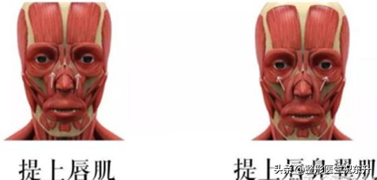 (左图为提上唇肌,右图为提上唇鼻翼肌。图中的箭头标出了这两部分肌肉在运动时的走势。)