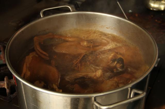 调料:老卤汁 2 000 g、香料包(1个)、姜片25 g、葱段50 g、精盐100 g、料酒50 g、糖色50 g