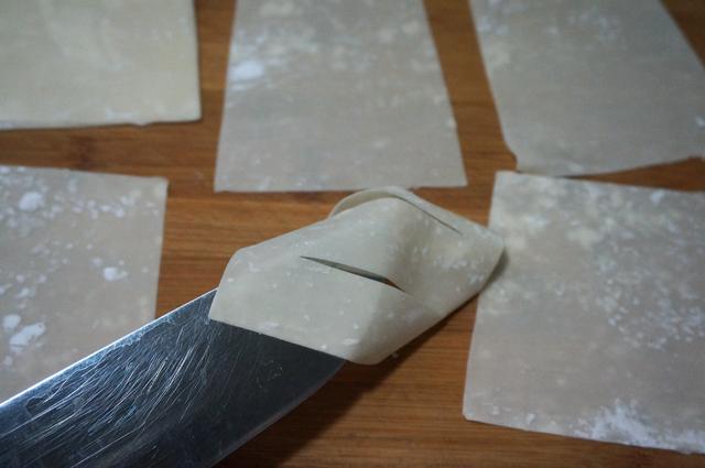 4. 用刀在馄饨皮上划两刀,这是外买的,薄而硬,如果是自己做的馄饨皮,建议也要薄薄的;