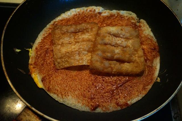 8. 待蛋液大部分凝固了,用铲子快速翻面,用刷子或者勺子将豆腐乳甜面酱均匀抹在没有鸡蛋的这一面,表面略干时,将炸好的馄饨皮薄脆放在上面;