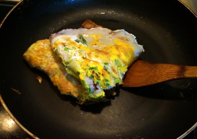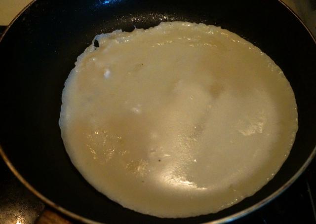 6. 锅中的油倒出另做它用,将适量的面糊倒入锅中,端起锅,让面糊铺满锅底,转小火,底面定型,表面留有一些未干的面糊;