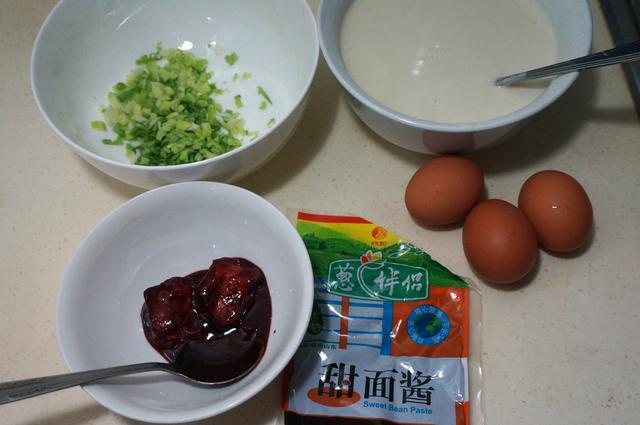 材料:面粉,凉水,玫瑰豆腐乳,甜面酱,葱花,鸡蛋,油,馄饨皮(辣椒酱,盐,香菜,香肠,根据口味来增加)