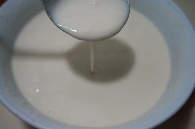 2. 面粉加凉水搅拌成这种稀糊糊,用勺子舀起来,顺畅地流下来,没有太具体的面粉和水的比例,稍微稀点或者稠点都成,只要面糊能够在锅里顺畅地转动并铺满锅底就可以;
