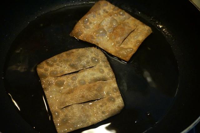 5. 平底锅中倒适量油,手放在油锅上方,感到有较强的热气时,将馄饨皮入锅中,炸成金黄色,捞出备用;