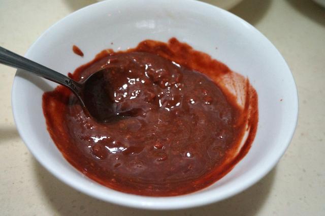 3. 豆腐乳用勺子碾碎,加适量的甜面酱混合均匀,喜欢辣的还可以加辣酱;