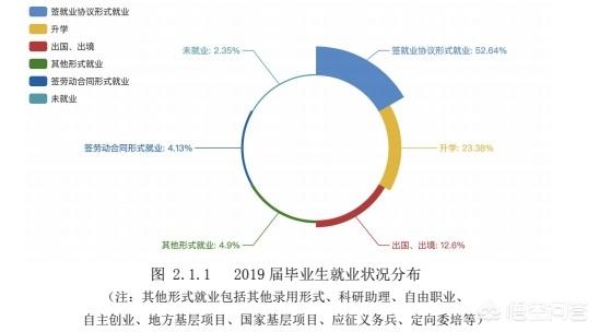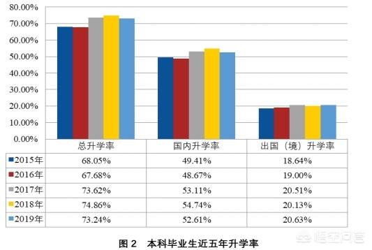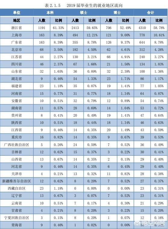 第一,在北航读本科的人,读研比例比较高。境内升学为52.61%,出国率为 20.63%,整体升学率为73.24%。浙大升学的比例较低,境内升学为23.38%,出国为12.6%,总体约36%。浙大的数据包括了博士、硕士,硕士的升学率跟本科生的差不多,略高一些,博士的则更高,所以,浙大本科生的升学比例要低于36%。