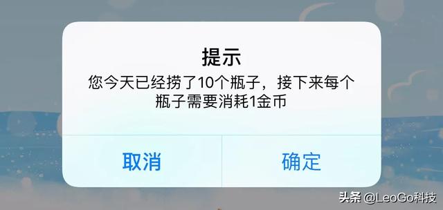 - 套路。我试着捞了几个瓶子,但是一个没捞到,反而出现了以下的提示:你已经捞了10个瓶子,接下来每个瓶子需要消耗一个金币。微信虽然对于瓶子数量也是具有限制,但是并没有下新漂流瓶APP这样明目张胆的需求报酬。