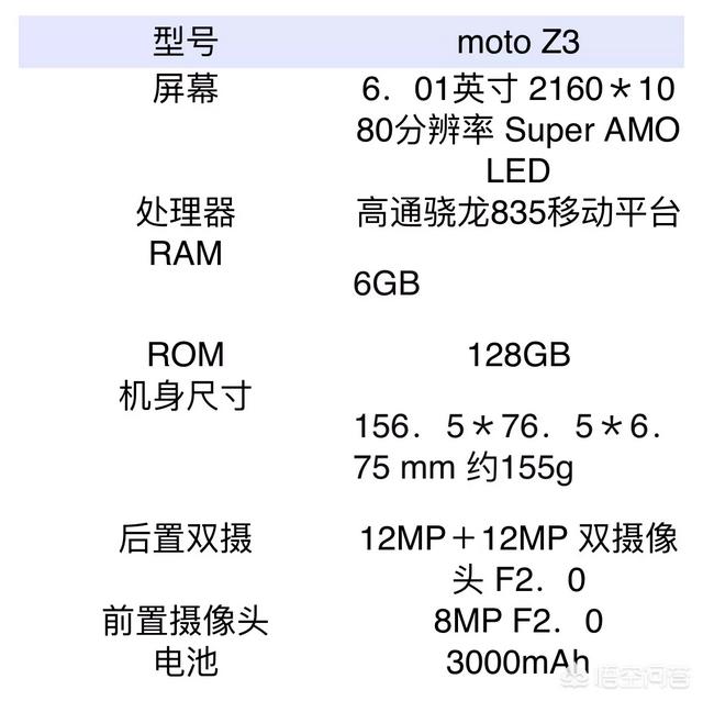 这块蛋糕到底好不好吃?我们先看看moto Z3的配置,采用AMOLED屏幕,分辨率达到2160×1080分辨率。处理器为骁龙835(在这个风云变化的市场,竟然没有使用骁龙845。)双1200万后置摄像头,前置800万,当然比较遗憾的是3000mah电池。