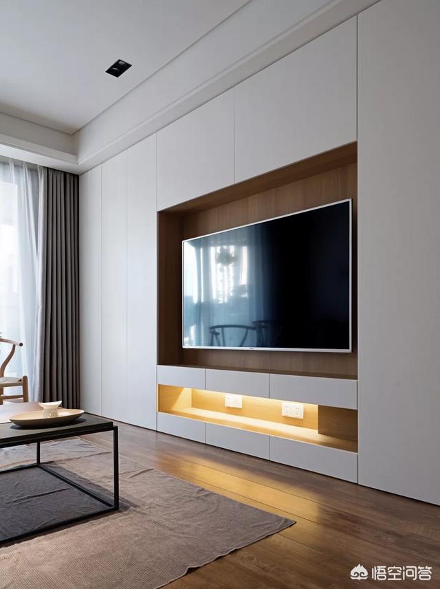 没有多余的装饰,比如这个电视墙,利用极简的纯色设计出美丽素雅的效果同时,也没有忽视它的实用性,大面积的收纳柜刚好可以用来解决收纳问题。