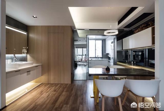 这里就是餐厅,左面设计洗漱台,并用木饰面作装饰,看起来清新自然,顺带了隐形门,右边则是餐桌椅配上开放式厨房。