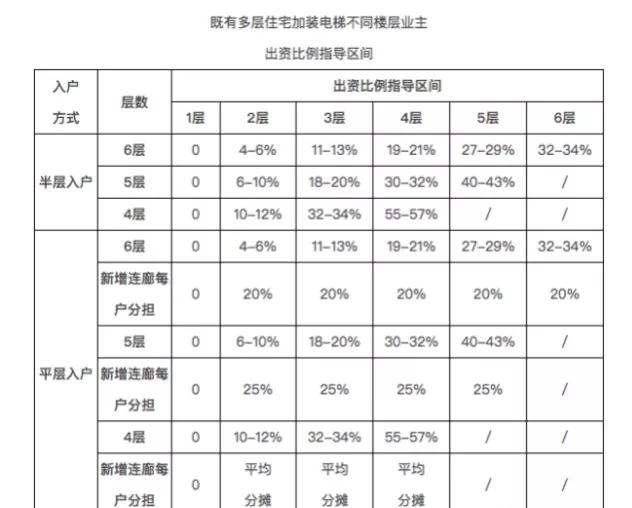 其中,以半层/平层入户的出资比例总楼层4楼的,一层免费,二层10-12%,三层32-34%,四层55-57%。