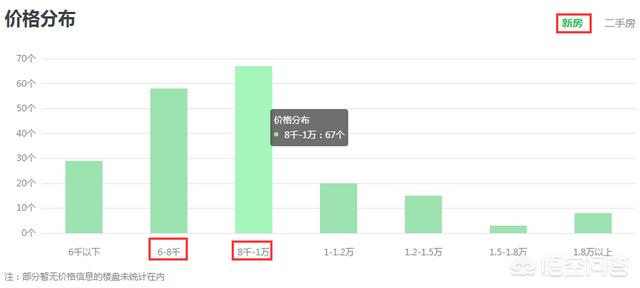 北海新盘整体价格段分布。价格以0.6万元~1.0万元为主,破万元以上的价格有小部分。
