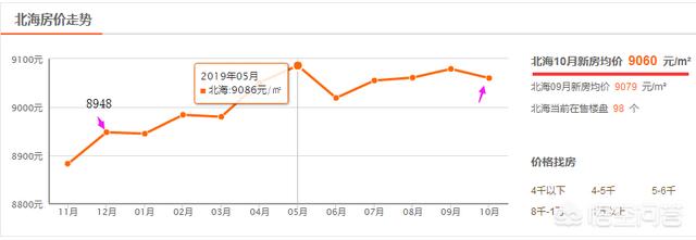 近一年来,北海房价呈震荡上涨走势。2019年10月,新盘参考价格9060元,较年初价格8948元,上涨1.25%。5月见高9086元后,呈出现了高位波动走势。