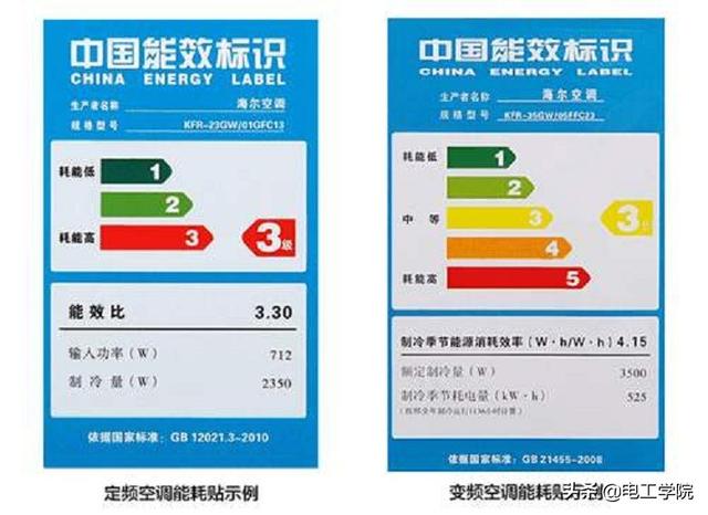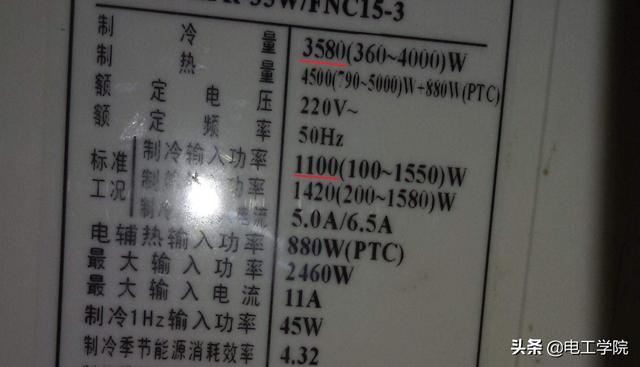 比如上面这个空调,它的制冷量为3580W,制冷功率为1100W,那么它的能效比为:3580÷1100=3.2。
