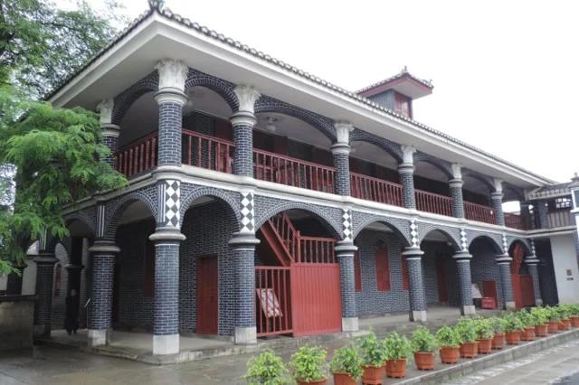遵义会议旧址位于遵义市老城红旗路(原子尹路)80号,老地名叫琵琶桥,会址是一座坐北朝南的二层楼房,为中西合璧的砖木结构建筑。上盖小灰瓦,歇山式屋顶上开一“老虎 窗”,有抱厦。整个建筑分主楼、跨院两部分。主楼楼屋四周有回廊,楼房的檐下柱间有十个 券拱支撑,保留了我国古建筑“彻上明造”的结构风格。楼上有梭门梭窗。檐柱顶饰有垩土堆 塑的花卉。东西两端各有一转角楼梯,外面加有一道木栅栏。门窗涂饰赭色,镶嵌彩色玻璃, 窗外层加有板门。楼内各房间设有壁橱。整个主楼通西阔25.75米,通进深16.95米,通高12米 占地面积528平方米。房屋原是黔军二十五军第二师师长柏辉章的私人官邸,是遵义城三十年 代最宏伟的建筑。