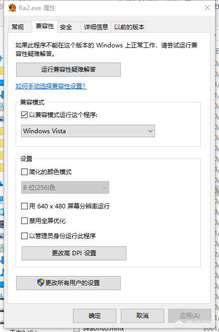 2、在游戏文件夹里找到“Ra2.exe”,右键-属性-兼容性,如下图: