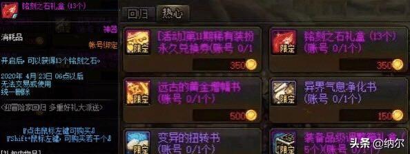 热心商店就比较厉害了,带回归获得硬币后,不仅有13个铭刻石头,还有增幅书和兑换券,体验服取消徽章需要的铭刻石之后,玩家需要的材料大幅度减少,这一步可以帮玩家快速制作出工作服,然后快乐的刷深渊爆神话装备。