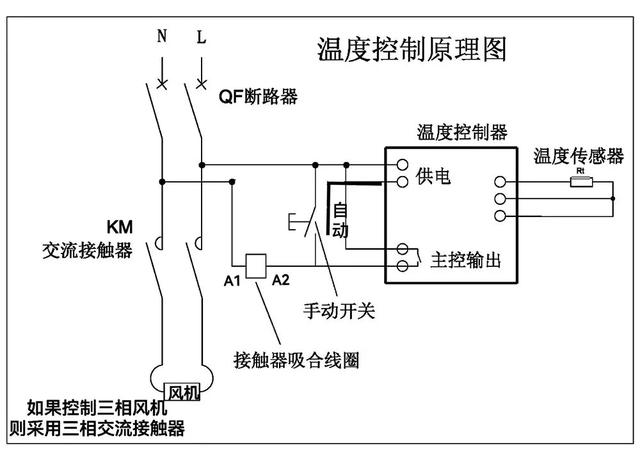 当需要自动控制温控器时,需要将旋钮开关拨至将13与12连接在一起,此时温控器的交流电源输入端得电开始工作。如果控制的风机为三相交流电动机,那么就要在交流接触器的输入端的主触头三组都用上,旋钮开关控制的手动/自动时,交流接触器线圈吸合,风机运转,释放时,风机停止运行。