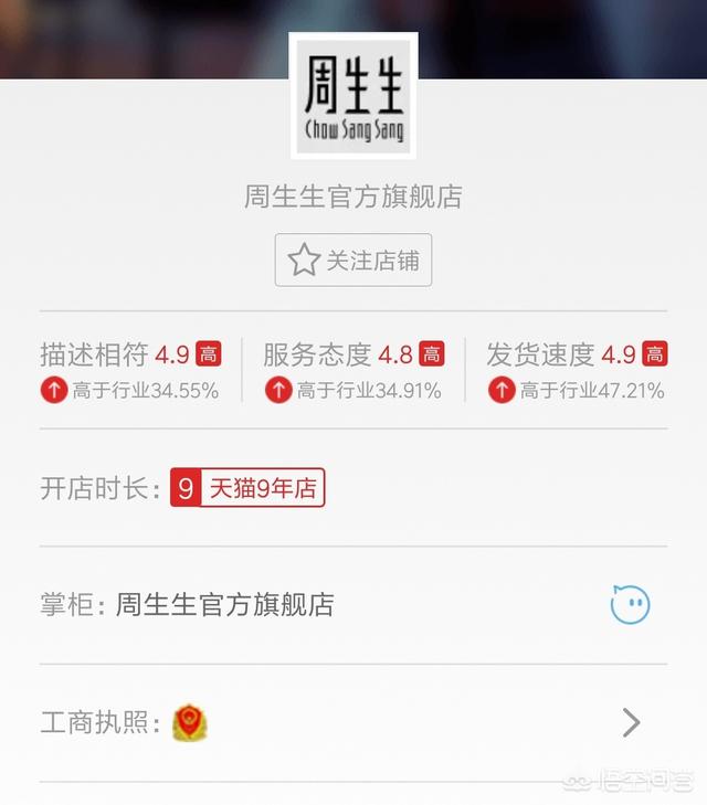 天猫周大福,周生生,这两家品牌粉丝都是300多万人,点店铺会查看到店铺信息,点工商执照可以看到注册登记信息。
