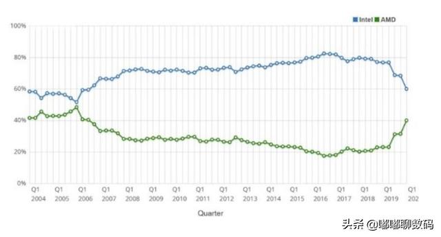 2019年7月,AMD推出zen2架构第三代锐龙,7nm工艺的加持和改进的架构使这一次AMD的单核效能逼近英特尔同期的水平,再加上实惠的价格,AMD在2019年下半年到2020年初的市场占有率提高很多,尤其是在一些国家的零售市场上几乎和英特尔平起平坐。像锐龙3600、锐龙3700X和3900X都是消费级市场非常热门的产品。