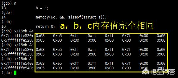 能够看出,此时变量 a,b,c 的内存值并不完全相同。输入 next 命令,使C语言程序运行到第 16 行,也即 return 0; 语句处,此时赋值语句以及 memcpy 语句都被执行完毕,再查看 a,b,c 的内存值,得到如下输出: