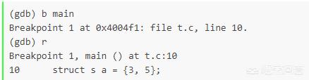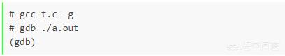 首先,输入 gcc t.c -g 编译上述C语言代码,得到可执行文件 a.out。接着,就可以使用 gdb 调试了: