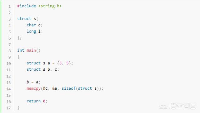 上面这段C语言代码很简单,main() 函数定义了 3 个结构体变量 a, b, c,其中 a 被初始化为 {3, 5},并通过赋值语句拷贝给 b,memcpy() 拷贝给 c。考察 a,b,c 占用的内存里的值,从最终“拷贝效果”上分析赋值语句和memcpy()的异同。
