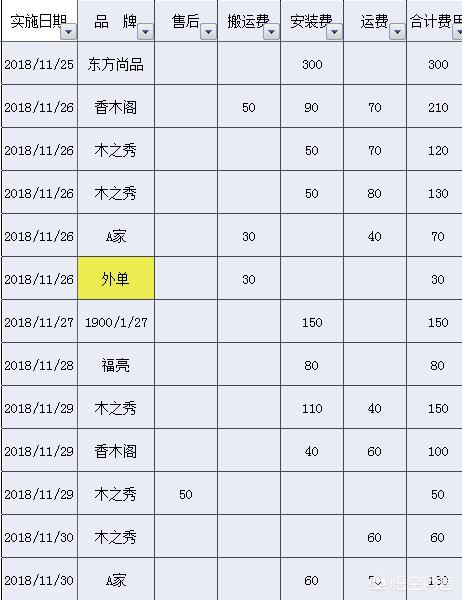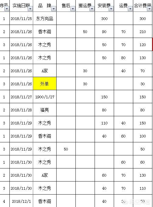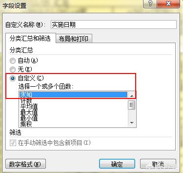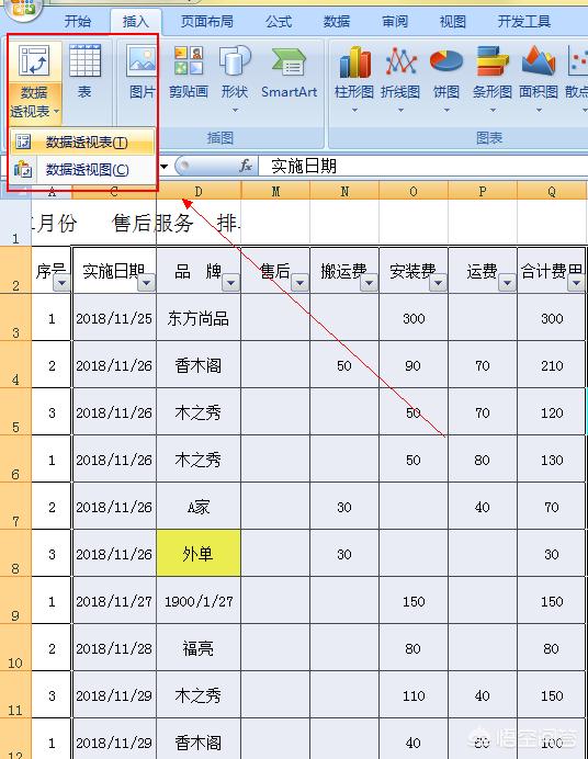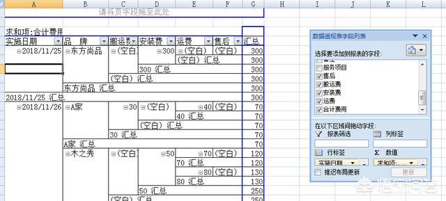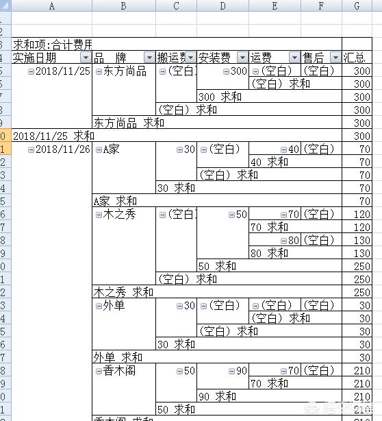 点击确定。这个,我们可以看到这个是以日期为分类的汇总方式。如果你想以品牌为分类,可以把品牌类目拉到实施日期前边就行了。你试试看。