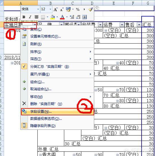5、然后,鼠标右键分别点击各类目,如图1,出现对话框时,点2“字段设置”。