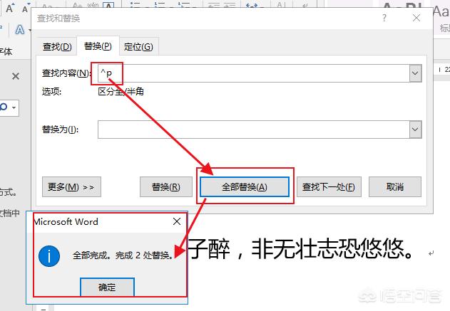 我们在弹出的对话栏里面的查找内容处输入^p符号,然后点击全部替换,之后系统就会提示替换成功,然后点击确定即可。