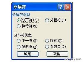 2、点击分隔符之后,再分隔符窗口上面选择分页符,然后点击确定,这样就成功的插入页面了。