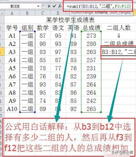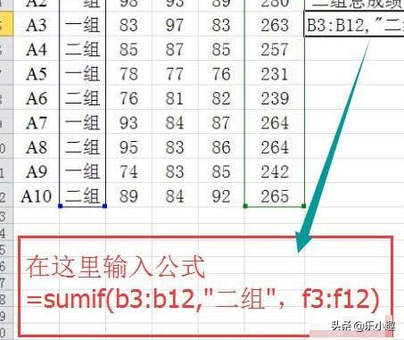 2、公式用白话解释:从b3到b12中选择有多少二组的人,然后再从f3到f12把这些二组的人的总成绩相加