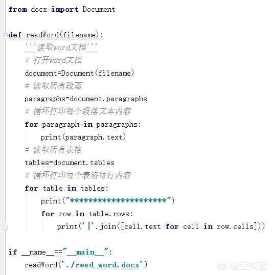对应读取代码如下,很简单,分别获取所有段落文本和表格数据,然后循环打印就行,readWord函数输入参数为需要读取的word文档: