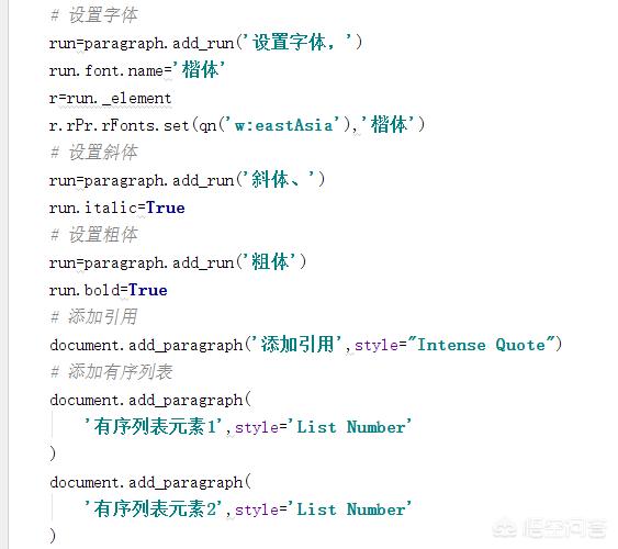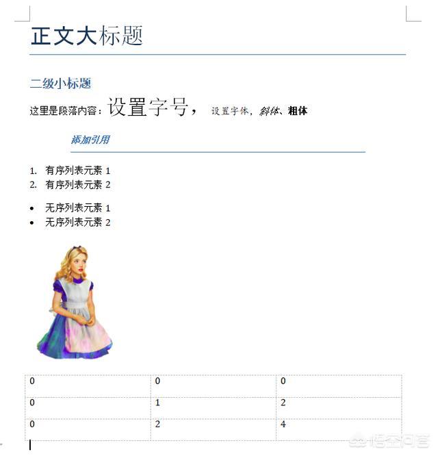 写入word文档,这个也很简单,构造相应数据结构,然后直接写入word文档就行,这里以添加标题、段落、图片、引用、表格,设置字体、有序列表和无序列表为例,主要测试代码如下: