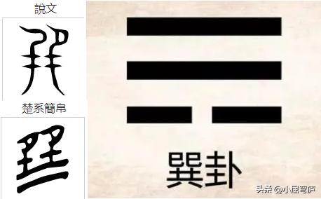 然后再看巽这个图像,有星星月亮,没有太阳的时候,除了晚上,还有乌云遮盖时间更多的冬天,这样的情境下,古人最强烈的感受就是来自西北的冷风,西北风刺骨,扑面生寒,用它来代表风最合适不过了,巽的甲骨文就是树木受到风的影响在摇动,因此巽为风坐落在西北。