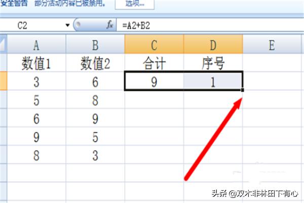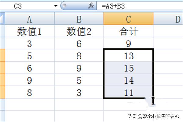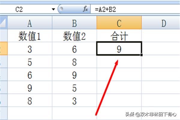 如图,在C2单元格中输入公式“=A2+B2”并按回车键即可实现前两列的求和操作。