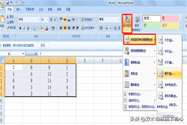 选中单元格区域,点击“条件格式”下拉列表中的“自动突出显示单元格规则”列表,并从中选择一项,如“等于”。
